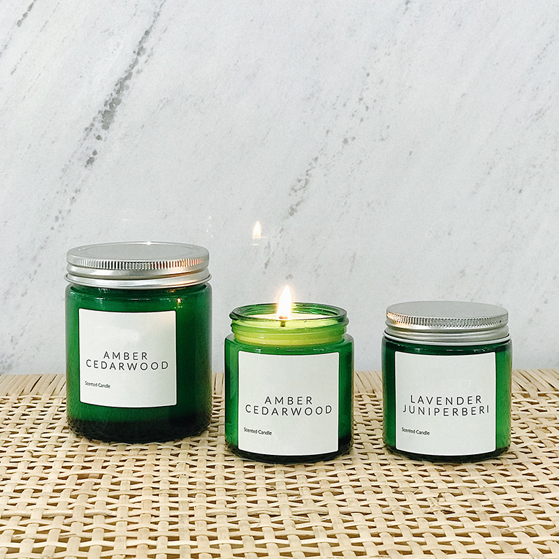 Fresh green glass candle holder,hand poured wax,white blank label full of all possibilities,there are not any complicated decorations on this scented candle.